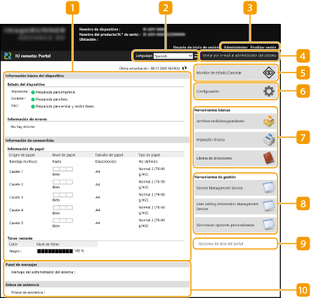 La página de portal que se muestra a continuación aparece al iniciar una sesión en la IU remota. En esta sección se describen los elementos que aparecen en la página de portal y las operaciones básicas.