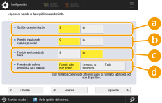 <Permitir creación de espacio personal>Para crear una carpeta exclusiva para uso personal en el Buzón avanzado, pulse <Sí>. Si <Gestión de autenticación> no está configurado como <Sí>, no se puede realizar al configuración.
