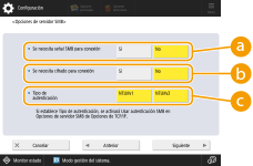1 | Seleccione el tipo de autenticación. <Se necesita señal SMB para conexión>Para solicitar una firma de paquete SMB al conectar con un servidor SMB, pulse <Sí>. <Se necesita cifrado para conexión>Para solicitar una conexión mediante comunicación cifrada SMB 3.0/3.1 al conectarse a un servidor SMB, pulse <Sí>. <Tipo de autenticación>Si configura el tipo de autenticación, la opción <Usar autenticación SMB> de <Opciones de servidor SMB> quedará configurada en <Sí>. <Opciones de servidor SMB> |