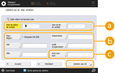 Gestion des clés et des certificatsVous pouvez vérifier les réglages détaillés ou supprimer des clés et des certificats sur l'écran qui s'affiche lorsque vous appuyez sur (Settings/Registration) <Réglages de gestion> <Gestion du périphérique> <Réglages de certificat> <Liste de clés et de certificats>. Si la liste des clés et des certificats ne s'affiche pas, appuyez sur <Liste clés et certif. pour ce périphérique> pour l'afficher.Si Si Si vous sélectionnez une clé et un certificat et appuyez sur <Détails du certificat>, des informations détaillées sur le certificat s'affichent. Vous pouvez aussi appuyer sur <Vérifier cert.> sur cet écran pour vérifier si le certificat est valide. Pour supprimer des clés et des certificats, sélectionnez les éléments à supprimer, puis appuyez sur <Supprimer> <Oui>. |