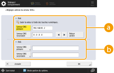 2 | Définissez les paramètres nécessaires. Selon votre environnement, saisissez l'adresse IP du serveur DNS. ![]() <IPv4>Appuyez sur <Serveur DNS primaire>, et saisissez l'adresse IPv4 du serveur DNS. Si un serveur DNS secondaire a été déployé, saisissez son adresse IP. Si vous ne configurez aucun serveur DNS secondaire, saisissez « 0.0.0.0 ». <IPv6>Appuyez sur <Serveur DNS primaire>, et saisissez l'adresse IPv6 du serveur DNS. Sont à proscrire les adresses commençant par « ff » (adresse multidiffusion), les adresses constituées uniquement de « 0 » ou les adresses Link-Local. Si un serveur DNS secondaire a été déployé, saisissez son adresse IP. Sont à proscrire les adresses commençant par "ff" (adresse multidiffusion), les adresses constituées uniquement de "0" ou les adresses Link-Local. Ce champ peut rester vierge. |