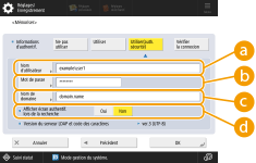 Lorsque vous saisissez l'adresse IP, assurez-vous que le serveur DNS ne prend en charge que la recherche directe. Si le serveur DNS ne prend en charge que la recherche, appuyez sur <Ne pas utiliser> ou <Utiliser>, dans <Informations d'authentif.>, à l'étape 4. Si vous sélectionnez <Utiliser(auth. sécurité)>, assurez-vous que le serveur DNS prend en charge la recherche inversée.