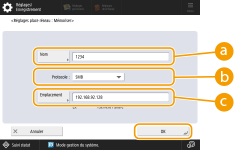 <Emplacement> s'affiche si vous sélectionnez <SMB> et <Nom d'hôte>s'affiche si vous sélectionnez <WebDAV> dans la configuration du protocole.