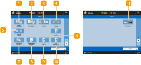 | <Echantillon impression> apparaît seulement si vous réglez des impressions multiples et l’un des réglages suivants en même temps. Notez que les fonctions disponibles peuvent varier en fonction de votre modèle et des options installées. <Tri séq. (Ordre pages)> <Décalage> <Rotation de 90 degrés> <Agrafage + Tri séquentiel> <Brochure> <Couverture de dessus> <Intercalaires> <Fusionner les fichiers et imprimer> lorsque plusieurs fichiers sont sélectionnés |