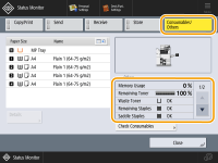 You can check the remaining amount of consumables from the Remote UI. Checking the Machine Status |