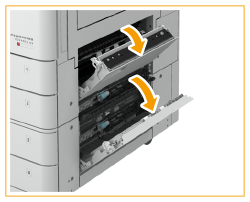 ![]() | Open the upper-right cover and lower-right cover of the paper drawer. When the Cassette Feeding Unit-AW is attached ![]() When the High Capacity Cassette Feeding Unit-E is attached ![]() |