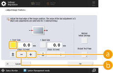 When you open the <Adjust Image Position> screen again after you close that screen by pressing <OK>, the values on screen are returned to <0>. However, the adjusted value is still effective. If you repeat steps, read off the value of register marks from new test page and input the new value.