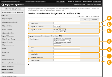 Les certificats générés sur cet appareil n'ont pas de signature CA , ce qui peut causer des erreurs de communication avec certains pairs de communication. Pour demander un certificat avec une signature CA, des données de demande de signature de certificat (CSR) sont requises. Un utilisateur qui se connecte avec des privilèges Administrateur peut générer une CSR.
