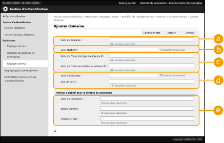 4 | Saisissez les informations nécessaires. ![]() [Nom de domaine :]Saisissez le nom de domaine de l'Active Directory destinataire de connexion (exemple : entreprise.domaine.fr). [Nom NetBIOS]Saisissez le nom de domaine NetBIOS (exemple : entreprise). [Nom de l'hôte principal ou adresse IP :] / [Nom de l'hôte secondaire ou adresse IP :]Saisissez le nom d'hôte du serveur Active Directory ou l’adresse IPv4. Si vous utilisez un second serveur, spécifiez le nom dans [Nom de l'hôte secondaire ou adresse IP :]. Exemple : en utilisant un nom d’hôte : ad-server1 En utilisant une adresse IPv4 : 192.168.18.138 [Nom d'utilisateur :] / [Mot de passe :]Saisissez le nom d'utilisateur et le mot de passe à utiliser pour accéder au serveur Active Directory et le rechercher. [Nom de connexion :] / [Affiché comme] / [Adresse e-mail]Spécifiez les champs de données (noms d'attribut) pour le nom de connexion, le nom d'affichage et l'adresse e-mail de chaque compte d'utilisateur sur le serveur Active Directory (Exemple : sAMAccountName, cn, mail). |
