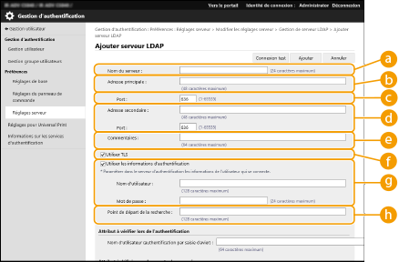 ![]() | Pour spécifier un serveur Active Directory ou LDAP comme dispositif d'authentification supplémentaire, vous devez enregistrer les informations du serveur utilisé pour l'authentification. Effectuez un test de connexion si nécessaire. |