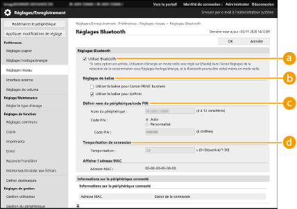 [Définir nom périphérique/code PIN]Ce réglage est inutile dans le cadre de la recherche de l'imprimante via la fonction Bluetooth.
