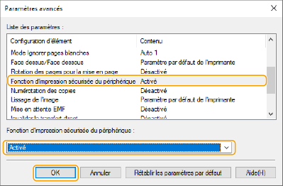 Sélectionnez [Activé] dans [Fonction d'impression sécurisée du périphérique] et cliquez sur [OK].