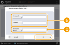 <Nome utente>/<Password>Inserire il nome utente e la password di un amministratore con privilegi di Amministratore. Assicurarsi che questo amministratore sia registrato come utente nella macchina client e nel server di autenticazione usato dalla macchina client.