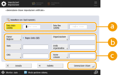 ![]() | La macchina può generare il codice e il certificato (certificato del server) utilizzato per la comunicazione crittografata TLS. Se si desidera iniziare a utilizzare immediatamente la comunicazione crittografata TLS , conviene utilizzare il codice e il certificato preinstallati nella macchina. Se necessario, richiedere a un amministratore di generare un codice e un certificato. Tuttavia, non dimenticare che la comunicazione crittografata TLS non viene abilitata solo generando un codice e un certificato. Configurazione del codice e del certificato per TLS |