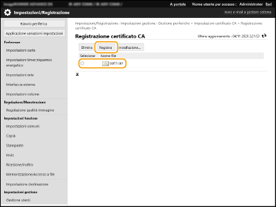 È possibile utilizzare la IU remota per registrare codici/certificati, certificati CA e certificati S/MIME sulla macchina dal computer. Designare un amministratore per registrare queste voci.