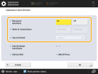 Normalmente, premere <On> in <Rilevazione automatica>. Il sistema di comunicazione e il tipo di Ethernet vengono rilevati e configurati automaticamente.