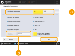 3 | Specificare le impostazioni necessarie e premere <OK>. ![]() <Utilizzo di Administrator>Se si usa l'amministratore, impostare su <On>. <Password crittografia>Se si usa una password diversa dall'autenticazione, deselezionare <Utilizzo stessa password usata per autenticazione>, premere <Password crittografia> e inserire la password. ![]() Se l'"Amministratore" è disabilitato, non sarà possibile impostare <Impostazioni Administrator> (l'impostazione di <Utilizzo di Administrator> è fissa su <Off>). |