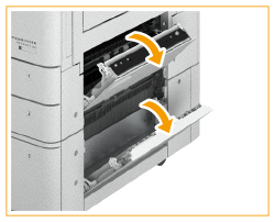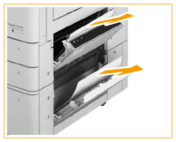 ![]() | Öffnen Sie die obere rechte Abdeckung und die untere rechte Abdeckung der Papierkassette. Wenn die Kassetteneinheit AW angebracht ist ![]() Wenn die High Capacity Cassette Feeding Unit E angebracht ist ![]() |
