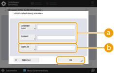 <Anwendername>/<Passwort>Geben Sie den Benutzernamen und das Passwort eines Administrators mit Administratorrechten ein. Stellen Sie sicher, dass dieser Administrator als ein Benutzer im Clientgerät und auf dem Authentifizierungsserver, der vom Clientgerät verwendet wird, registriert ist.