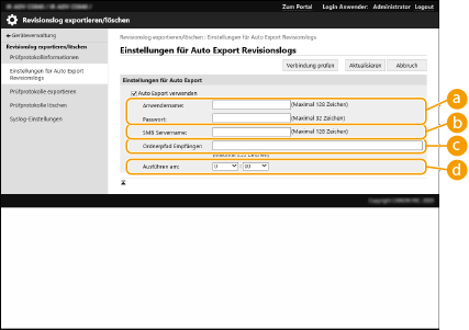 Nach dem erfolgreichen automatischen Export der Revisionslogs werden die gesammelten Revisionslogs automatisch gelöscht. Revisionslogs können nicht manuell gelöscht werden. Nachdem das automatische Exportieren und Löschen der Audit-Protokolle erfolgreich durchgeführt wurde, werden die einzelnen Protokolle generiert. Wenn bis zum Zeitpunkt des nächsten automatischen Exports keine anderen Protokollsammlungen erfolgen, wird das Audit-Protokoll nicht automatisch exportiert. Sie können die Revisionslogs auch manuell über Remote UI exportieren. Exportieren eines Protokolls in eine Datei Wenn der automatische Export fehlschlägt, unternimmt das Gerät mehrere erneute Versuche. Auf dem Bedienfeld des Geräts wird eine Fehlermeldung angezeigt, sobald ein automatischer Export fehlgeschlagen ist. Geben Sie einen SMB-Server für Windows Server 2012 oder höher oder für Windows 8 oder höher an. Bei ausgeschaltetem Gerät wird auch zu den festgelegten Zeiten kein Export durchgeführt. Der Export wird auch beim nächsten Start des Geräts nicht durchgeführt. Wenn sich das Gerät im Schlafmodus befindet, wird es zur festgelegten Zeit automatisch reaktiviert, und der Export wird durchgeführt. Beachten Sie, dass bei Verwendung eines Servers, der eine nach SMB 3.0/3.1 verschlüsselte Kommunikation nicht unterstützt, die Revisionsprotokolldaten beim automatischen Export unverschlüsselt über die Kommunikationspfade übertragen werden. Je nach Umgebung wird der automatische Export von Logs eventuell später als zur festgelegten Zeit durchgeführt. |