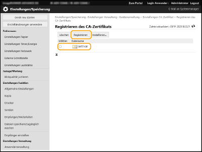 Wählen Sie das CA-Zertifikat, das Sie registrieren möchten, und klicken Sie dann auf [Registrieren...].