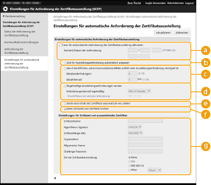 Sie können von einem SCEP-Server (Simple Certificate Enrollment Protocol), der Zertifikate verwaltet, die Ausstellung eines Zertifikats anfordern, das für die mit dem Gerät erzeugten Schlüssel erforderlich ist. Zertifikate vom SCEP-Server werden automatisch im Gerät registriert. Um die Ausstellung eines Zertifikats anzufordern, sind Administrator-Rechte erforderlich.