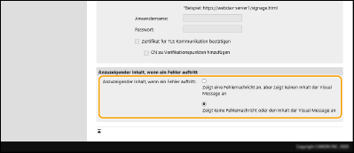 Wenn die Funktion Visual Message festgesetzt ist, können Sie den Inhalt unter <Visual Message> im Startseite, unabhängig vom Zeitpunkt, überprüfen. Der zuletzt angezeigte Inhalt wird angezeigt. Legen Sie für den anzuzeigenden Inhalt eine Datei fest, die auf einem Dateiserver oder unter Erweiterter Platz im gleichen Netzwerk gespeichert ist. Verwendung als einfacher Dateiserver Sie können über einen Proxy-Server auch eine Webseite auf dem Internet als Inhalt festlegen. Die Proxy-Einstellungen, die für diese Funktion verwendet werden, sind die gleichen wie die Einstellungen unter <Einstellungen Proxy>. Wenn ein Proxy eingerichtet ist, erscheint der festgelegte Inhalt möglicherweise nicht. Legen Sie in diesem Fall eine Ausnahmeadresse fest, so dass der Proxy-Server nicht verwendet wird. Einrichten von Ausnahmeadressen, wenn kein Proxy-Server verwendet wird Wenn die Funktion für erzwungen angehaltene Druckaufträge und das Kontrollkästchen für [Wenn Druckauftrag startet anzeigen] aktiviert sind, wird zu Beginn des Druckens der Inhalt angezeigt. |