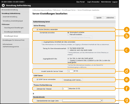 ![]() | Um ein Active Directory oder einen LDAP-Server als ein zusätzliches Authentifizierungsgerät festzulegen, müssen Sie die für die Authentifizierung verwendeten Informationen des Servers registrieren. Führen Sie bei Bedarf einen Verbindungstest durch. |