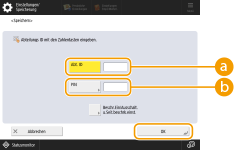 3 | Geben Sie die Abteilungs-ID und PIN ein, und drücken Sie <OK>. ![]() <Abt. ID>Geben Sie eine maximal 7-stellige Zahl für die Abteilungs-ID ein. <PIN>Geben Sie eine maximal siebenstellige Zahl für die PIN ein, und drücken Sie <Bestätigen>. Geben Sie zur Bestätigung die PIN erneut ein, und drücken Sie <OK>. ![]() Sie können keine Abteilungs-ID oder PIN registrieren, die lediglich aus 0 besteht, wie beispielsweise "00" oder "0000000". Wenn Sie weniger als sieben Ziffern eingeben, werden am Anfang der Zahl Nullen angefügt, und es wird eine siebenstellige Zahl festgelegt. Sie können <Beschr.Ein/Ausschalt. u.Seit.beschrk.einst.> drücken, um die Gesamtanzahl der Seiten festzulegen, die die Abteilung für den Kopier-, Scan- und Druckvorgang verwenden darf. Sie können auch eine siebenstellige Eingabe als Voraussetzung für die Abteilungs-IDs und PINs festlegen. Weitere Informationen erhalten Sie von Ihrem Händler oder Kundendienst. |