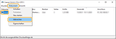 Wählen Sie das abzubrechende Dokument aus, und klicken Sie auf [Dokument]  [Abbrechen].