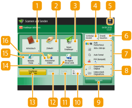 Wenn Sie <Scannen und Senden> (Bildschirm <Startseite>) drücken, wird das Grundfunktionsdisplay zum Scannen angezeigt.