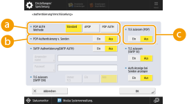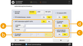 Um gescannte Dokumente ohne Umweg über einen Computer per E-Mail oder I-Fax direkt zu versenden, müssen Sie die Kommunikationseinstellungen, wie beispielsweise Mailserver, Authentifizierungsverfahren usw., einrichten. Im Allgemeinen wird ein SMTP-Server zum Senden und ein SMTP-Server oder ein POP3-Server zum Empfangen verwendet. Sie können die Codierung und andere Parameter einrichten. Näheres zu den erforderlichen Einstellungen erfahren Sie von dem Internetanbieter oder den Netzwerkadministratoren.