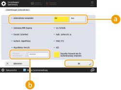 3 | Legen Sie die erforderlichen Einstellungen fest, und drücken Sie <OK>. ![]() <Administrator verwenden>Wenn Sie den Administratorzugriff verwenden, setzen Sie dies auf <Ein>. <Passwort Verschlüssel.>Wenn Sie ein Passwort verwenden, das sich von der Authentifizierung unterscheidet, deaktivieren Sie <Dasselbe Passwort wie für Authentisierung vrwenden>, drücken Sie <Passwort Verschlüssel.>, und geben Sie das Passwort ein. ![]() Wenn "Administrator" deaktiviert ist, können Sie <Einstellungen Administrator> nicht festlegen (die Einstellung von <Administrator verwenden> ist fest auf <Aus> gesetzt). |