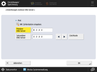 Drücken Sie <Präferenzen>  <Netzwerk>  <Einstellungen Nebenleitung>  <Einstell. für Systemdatenkommunik.>  <Einstellungen Adresse DNS-Server>.
