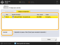 (Detener) en el panel de control mientras se está procesando un trabajo de impresión/envío y se muestra una pantalla que lleva a <Trabajos de envío>/<Trabajos de impresión>, el trabajo de impresión/envío en curso se detiene y aparece <Trabajos de envío>/<Trabajos de impresión>.