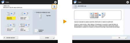 Ver la guía de funciones y la página de preguntas frecuentesPulse <Tutorial/Preg.frecuentes> para ver una pantalla que explica lo que puede hacer con las funciones del equipo, así como consejos de uso de la copiadora, el escáner, etc. Puede ver esta pantalla cuando desee saber más sobre las funciones disponibles y cómo utilizarlas. También puede acceder a la página de preguntas frecuentes desde un dispositivo móvil. ![]() Ejemplo 1: Tutorial de funciones de copia Al seleccionar un elemento de la lista, aparece la pantalla del tutorial. ![]() Ejemplo 2: Visualización de la página de preguntas frecuentes Al pulsar<Preguntas frecuentes>, aparece un código QR. Puede visualizar la página de preguntas frecuentes sobre el equipo leyendo este código QR en un dispositivo móvil como un smartphone o tableta. ![]() Utilice la función de AyudaSegún la función que se muestra, a veces aparece en la parte superior derecha de la pantalla. Pulse para consultar la descripción y el método de funcionamiento de la función.![]() Pulse <Fin> para volver a la pantalla anterior. Utilizar del mismo modo que con un smartphone (desplazar/pellizcar/arrastrar y soltar)En algunas pantallas puede cambiar de página o deslizarse desplazando el dedo arriba/abajo o a izquierda/derecha sobre la pantalla como lo haría con un smartphone. ![]() También puede acercar o alejar la pantalla utilizando dos dedos para pellizcar hacia fuera o hacia dentro. Puede arrastrar la pantalla ampliada con el dedo. Personalización del aspecto de la pantalla y las condiciones operativas. ![]() Si <Permitir ampliación de pantalla> se ha ajustado en <Sí>, toda la pantalla se acerca o se aleja cuando se pellizca en la pantalla de vista preliminar. Si <Permitir ampliación de pantalla> se ha ajustado en <No>, solo se acercará o se alejará la imagen de vista preliminar.