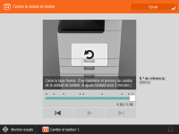 El mensaje de sustitución de la unidad de tambor que aparece en la parte inferior de la pantalla varía en función de su contrato. Pulse <Cerrar> cuando haya acabado de sustituir la unidad de tambor. |