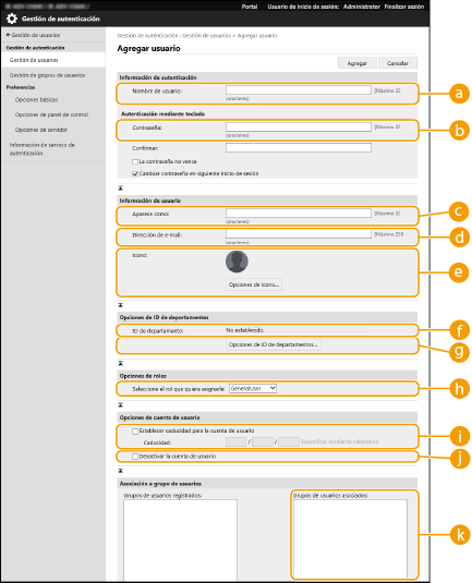 dc | No | De 0 a 32 caracteres | Caracteres de control | - (N/A) | No se puede cambiar. Se asignará automáticamente para los siguientes usuarios. Usuarios registrados que siguen la autenticación del servidor Usuarios registrados mediante <Registrar automáticamente cuando se recibe un trabajo> en inicio de sesión de imagen |