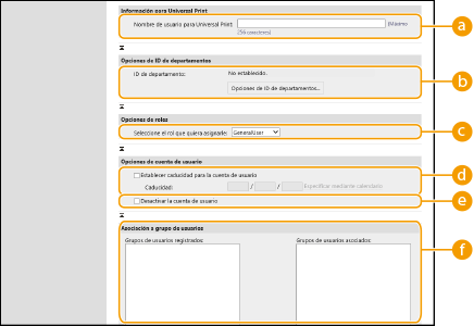 [ID de departamento:]Si utiliza la Gestión de ID de departamentos, deberá hacer clic en [Opciones de ID de departamentos...] y seleccionar en la lista el ID de departamento que se asignará al usuario. En primer lugar, registre los ID de departamento necesarios en [Guardar nuevo departamento...] en la pantalla de lista. Si el ID de departamento que especifique aquí es eliminado más tarde, recuerde cambiar esta configuración.