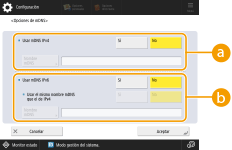 2 | Configure las opciones necesarias. ![]() <IPv4>Pulse <Nombre de host> y escriba el nombre de host del equipo para registrarse en el servidor DNS usando caracteres alfanuméricos. Pulse <Nombre de dominio> e introduzca el nombre de dominio al que pertenece el equipo empleando caracteres alfanuméricos (Ejemplo: "ejemplo.com"). <IPv6>Para establecer el mismo nombre de host y nombre de dominio que para IPv4, pulse <Sí> en <Usar el mismo nombre de host/nombre de dominio que para IPv4>. Para establecer una configuración distinta de IPv4, pulse <No>. Para establecer un nombre de host distinto del de IPv4, pulse <Nombre de host> y escriba el nombre de host del equipo para registrarse en el servidor DNS usando caracteres alfanuméricos. Para establecer un nombre de host distinto del de IPv4, pulse <Nombre de dominio> y escriba el nombre de dominio al que pertenece el equipo usando caracteres alfanuméricos. (Ejemplo: "ejemplo.com"). ![]() Si configura <Usar DHCPv6> como <Sí> para las opciones de dirección con estado (Configurar una dirección IPv6), se sobrescribirá el nombre de dominio configurado manualmente. Si configura <Usar el mismo nombre de host/nombre de dominio que para IPv4> como <Sí>, se utiliza el nombre de dominio recuperado del servidor DHCPv6. |