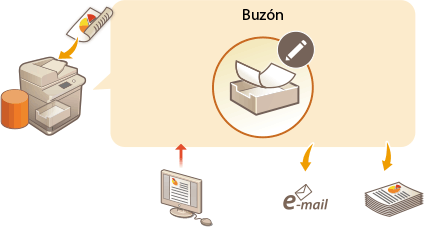 El dispositivo de almacenamiento instalado en el equipo tiene un espacio de almacenamiento de datos temporal llamado "Buzón de correo". Si guarda documentos en el Buzón de correo, puede realizar cambios sencillos como combinar archivos y eliminar páginas de archivos, desde el equipo. Los documentos editados pueden convertirse a formatos de archivo como PDF y TIFF, compatibles con un ordenador, y enviarse al destino deseado por correo electrónico o similar. También puede guardar documentos y conservar las opciones de impresión, como la impresión a doble cara, de modo que puede imprimir sin tener que especificar de nuevo las opciones.