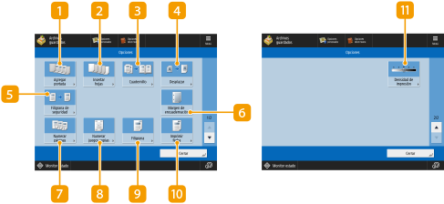 | <Muestra impres.> aparece solo si establece la realización de varias impresiones y uno de los siguientes ajustes al mismo tiempo. Tenga en cuenta que las funciones disponibles pueden variar en función del modelo y de las opciones instaladas. <Clasificar (por juegos)> <Desplazar> <Rotar 90 grados> <Grapar + Clasificar> <Cuadernillo> <Portada> <Insertar hojas> <Fusionar archivos e imprimir> cuando se seleccionan varios archivos |