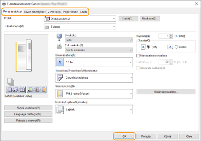 Vaihda tarvittaessa välilehtiä määrittääksesi tulostusasetukset.