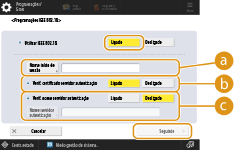 Para verificar um nome comum no certificado do servidor, selecione <Ligado> em <Verif. nome servidor autenticação> e introduza o nome do servidor de autenticação gravado pelo utilizador com sessão iniciada em <Nome servidor autenticação>.