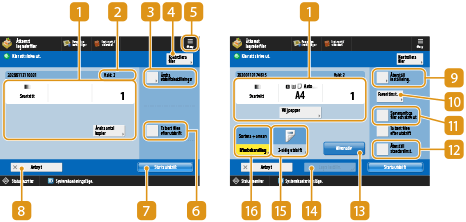 Visar status för inställningen för pappersformat för utskrift och antalet utskrifter. Kom ihåg att bekräfta inställningarna för att skriva ut på rätt sätt. För att ändra inställningarna, tryck på knappen under skärmbildsdelen. Om du vill ändra antalet utskrifter, anger du värdet med sifferknapparna.