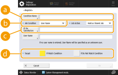 You can set detailed conditions for holding printer jobs, such as the user or IP address. If no conditions are set, all print jobs are held except for jobs from unidentified users. If no conditions are set and a print job from an unidentified user is received, it is canceled without being held.