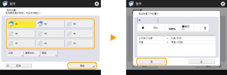 对于“复印”与“扫描和发送”功能,您也可以将本机设置为在调用注册的设置时不显示确认屏幕。