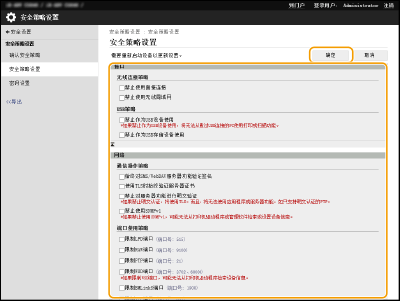 可以批量应用和管理与信息安全相关的本机设置。建议负责管理安全策略的信息安全管理员遵照组织策略对本机应用安全策略。要配置安全策略,请以“管理员”权限登录到“远程用户界面”。