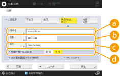 2 | 输入用户名和密码,然后进行必要的设置。 ![]() <用户名>输入在LDAP服务器中注册的本机用户名(示例:“user1”)。 <密码>输入LDAP服务器上注册的密码。当输入密码时,显示<确认>以进行确认。再次输入密码。 <域名>输入本机的域名。 <检索时显示认证屏幕>当搜索接收方时,要显示用户名和密码输入屏幕,请按<打开>。 |