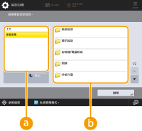 (設定/註冊) t以顯示 <設定/註冊> 畫面。先按此鍵可變更各個設定,例如紙張設定、顯示設定和網路設定。在此畫面上,您也可以註冊接收者,例如電子郵件位址和傳真號碼。